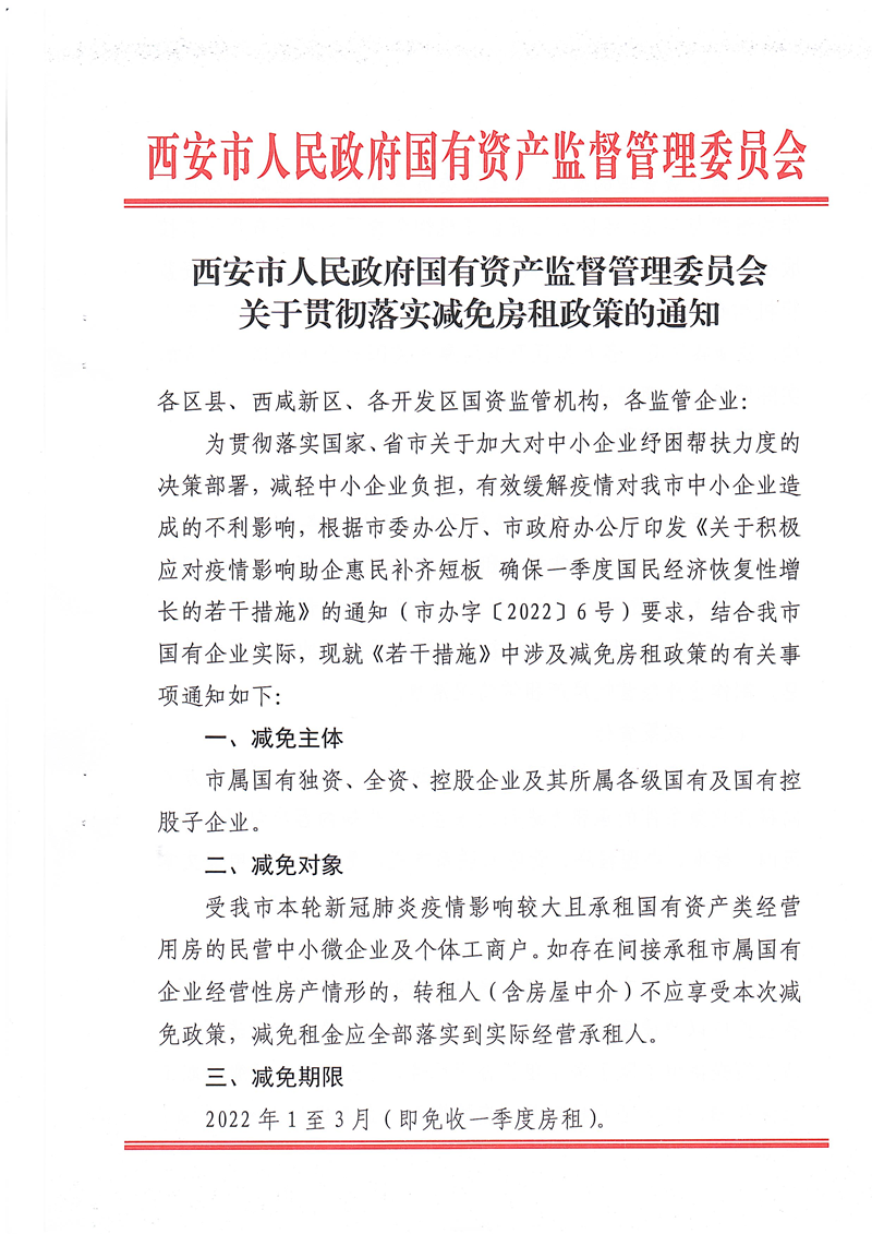 西安市國資委關(guān)于做好減免國有企業(yè)房屋租金工作有關(guān)事項的補充通知